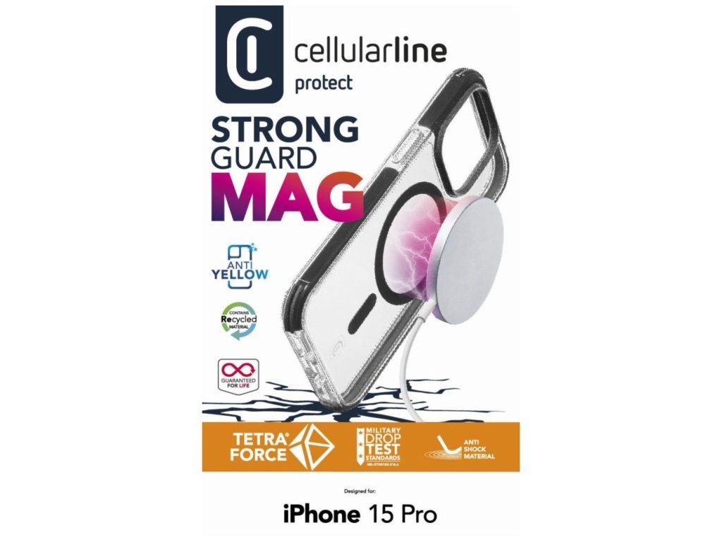 Extra odolný kryt Cellularline Tetra Force Strong Guard Mag představuje ultimátní ochranu pro váš telefon. Díky integrovaným magnetům kryt perfektně spolupracuje s MagSafe nabíječkami a dalším příslušenstvím. Tvrzená záda krytu v kombinaci s ohebnými boky ochrání váš telefon před veškerými nárazy, škrábanci a dalším poškozením. Před pády chrání technologie IDS (Impact Dissipating System), která využívá inovativní materiál Versaflex po obvodu krytu. Ten při pádu dokáže rozložit sílu nárazu, zcela ji pohltit a zabránit možnému poškození vnějších i vnitřních částí smartphonu. Telefon tak není vystaven veškeré síle nárazu jen na jednom místě, jak je běžné u jiných krytů. Pro ochranu displeje a fotoaparátu má kryt speciálně zesílené a zvýšené části na přední i zadní straně. Materiál krytu obsahuje antibakteriální technologií Microban®, která eliminuje až 99,9 % růstu bakterií a chrání tak vaše zdraví. Všechny kryty Tetra Force prošla speciálním Military testem a vydrží pád z výšky až 3 metrů.